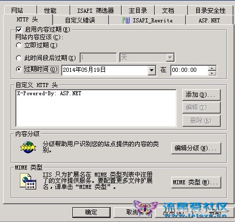在IIS中定位到網(wǎng)站存放圖片的文件夾,然后打開屬性窗口,在HTTP Headers中做出如下選擇,要求組件的過期時(shí)間為本次請(qǐng)求后1天,也就是在本地緩存86400秒。