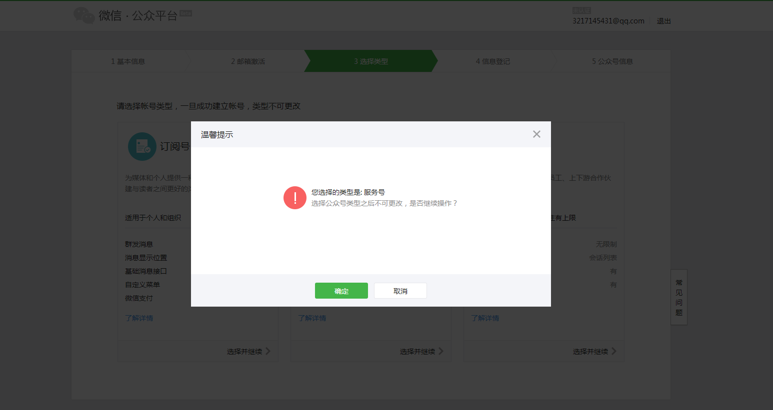 不管是選擇服務(wù)號還是訂閱號只能有一次選擇的機(jī)會,選擇過后就不能進(jìn)行修改,當(dāng)您選擇過后會彈出一個(gè)窗口,如圖: