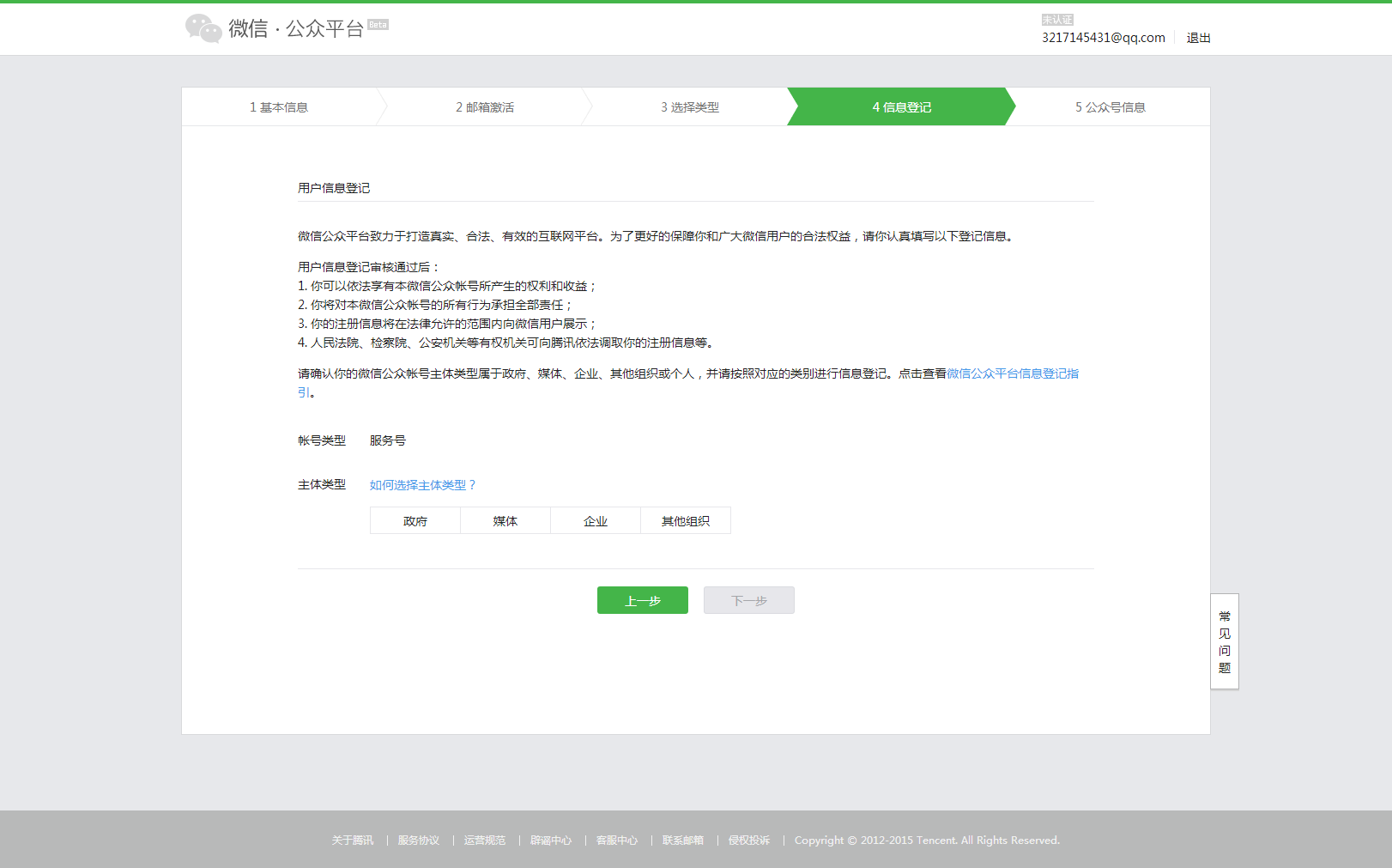 2、注冊過QQ賬號以后,登錄到https://mp.weixin.qq.com/的頁面,進(jìn)行企業(yè)微信服務(wù)號的注冊。如圖: