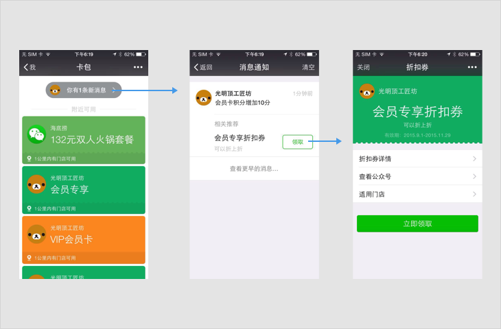 為了方便商戶進行會員管理,公眾平臺豐富了微信會員卡的展示能力、推出微信會員卡一鍵激活功能、卡券消息運營位功能和快速買單功能。