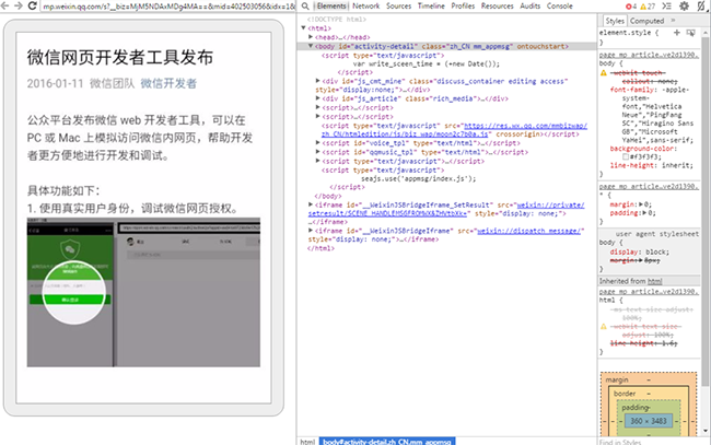 為此,微信 web 開發(fā)者工具同步推出0.5.0版本,繼支持測試號、企業(yè)號、第三方平臺開發(fā)者的使用之后,新增支持實時映射手機屏幕到 PC 或者 Mac 上,可以遠(yuǎn)程調(diào)試 X5 Blink 內(nèi)核上的網(wǎng)頁。