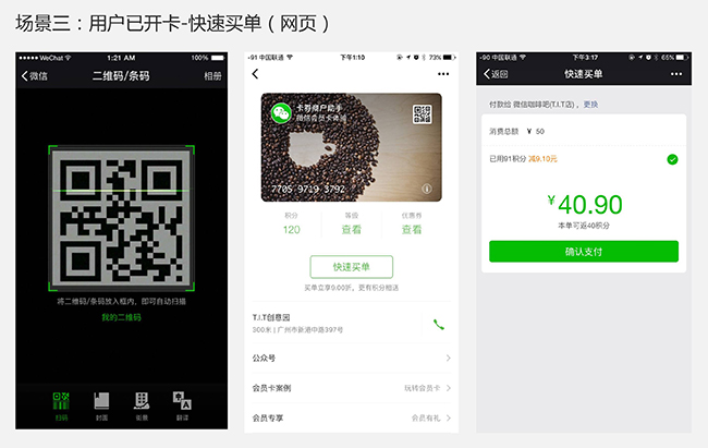 新版會員卡將多種功能集合在一個二維碼上:未領卡用戶掃碼后,領取頁面將默認勾選關注公眾號選項,用戶點擊立即領取后,將在領卡同時關注商家公眾號;領卡未激活用戶掃碼后引導激活;已領卡并激活的會員用戶掃碼可直達卡面,進行支付、查看積分等商家設置的操作。