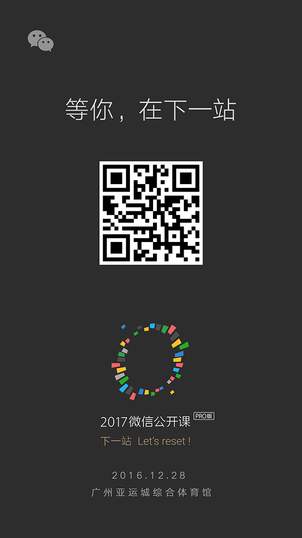 2016年12月28日,2017微信公開課Pro版與你相約在廣州,主題為“下一站”,已正式開放售票。