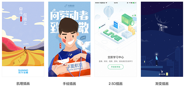 B、插畫(huà):這種形式的閃屏給用戶(hù)一種很溫暖的感覺(jué),很容易會(huì)引起共鳴,喚起我們某個(gè)時(shí)間段的回憶。目前,據(jù)天津網(wǎng)站建設(shè)所了解插畫(huà)手法用的比較多且比較流行的是:肌理插畫(huà)、手繪插畫(huà)、漸變插畫(huà)等。