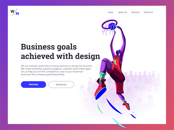 例如:下面的插畫是基于關(guān)鍵詞“目標(biāo)”來(lái)進(jìn)行設(shè)計(jì)的?;@球運(yùn)動(dòng)員灌籃的這一動(dòng)作和“抵達(dá)目標(biāo)”在寓意上是完美契合的,因此,結(jié)合豐富的色彩,通過(guò)控制插畫的角度和角色形體,營(yíng)造出力量感和動(dòng)感。
