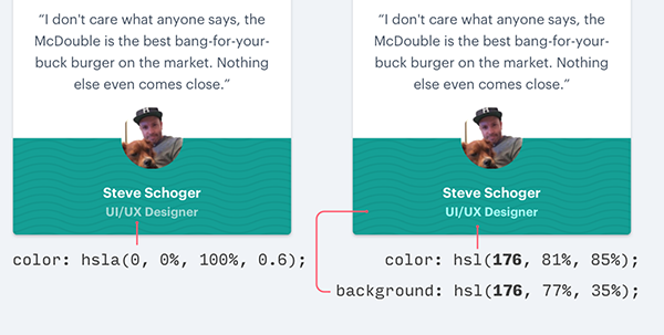 若背景顏色是白色,這時將黑色的文本改成灰色,不失為一個不錯的淡化其視覺效果的做法,但是若背景是色彩的,那這就是另外一回事了。實(shí)際上,白色背景下文本有黑變灰達(dá)到了降低對比度的效果,但在色彩背景下,想要降低對比度正確的做法就是讓文本逐步的接近背景色,而并非是改為灰色。一般來說,想要降低和背景色之間的對比,通常做法有兩種: