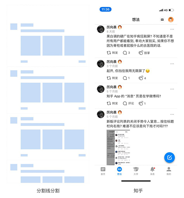 總結(jié):這種分割線通常使用在UGC模塊上,首先需要考慮到屏幕的利用率,其次對(duì)每個(gè)用戶產(chǎn)生的內(nèi)容要進(jìn)行分割,但存在感不能太強(qiáng),避免干擾用戶對(duì)內(nèi)容本身的注意力,所以通常會(huì)使用在UGC模塊上。