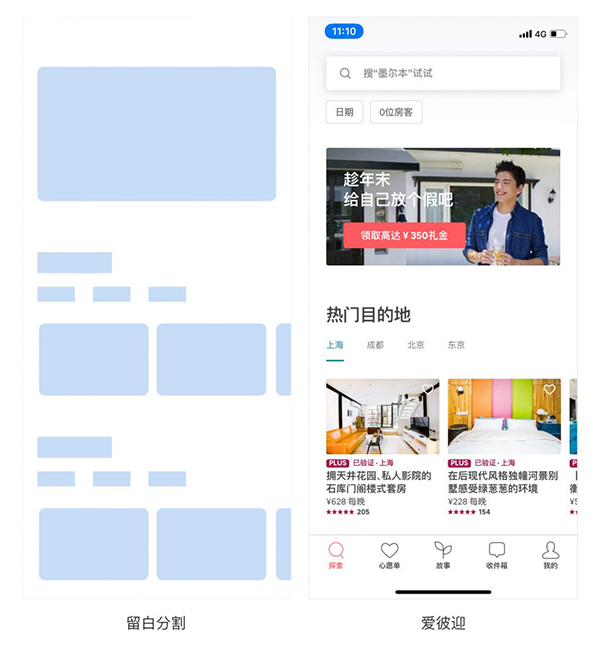 所謂的留白其實(shí)是指頁(yè)面元素間或包圍頁(yè)面元素的空白空間,雖然這種手法可能會(huì)被認(rèn)為浪費(fèi)空間,但不得不說(shuō),目前大部分app的首頁(yè)都是采用留白分割,如圖: