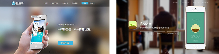 二、目前,一些抽象隱晦的、大尺寸的、虛化或模糊的圖也隨處可見。但是使用虛化或模糊圖的情況會(huì)有些復(fù)雜。它只有在圖片本身品質(zhì)很好的情況下才會(huì)帶來好的效果,如果為了掩飾圖片質(zhì)量的低劣而去虛化,效果會(huì)適得其反。所以我們必須得清楚為什么要把圖片虛化,比如天津網(wǎng)站設(shè)計(jì)——文率科技做的微瓶子這個(gè)網(wǎng)站需要非常明顯的虛化后才有更好的效果,而Forest 這個(gè)網(wǎng)站只需要把人的寫實(shí)背景輕微虛化就可以了。