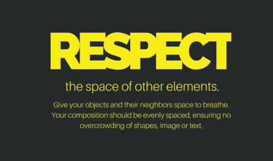 “Respect”這個詞的字間距被壓縮,從而讓整個單詞都顯得更有凝聚力,讓人感到和諧,舒服。在平面設(shè)計中排版的位置是非常重要的,因此各種元素間距需要根據(jù)實際情況來調(diào)整,當(dāng)內(nèi)容多的時候可以適當(dāng)收緊,當(dāng)少的時候可以適當(dāng)放松。同時還有間距大小都需要兼顧到基本的可讀性,不宜分太開,同時也不易離太近,這樣的話很容易在一定的程度上增加了閱讀的難度。