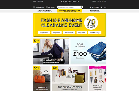 隱藏式菜單在電商類網(wǎng)站中的作用是非常重要的,巧妙的利用隱藏式菜單能夠清理電商網(wǎng)站雜亂的版面,最初它們是為移動(dòng)端設(shè)計(jì)的,但現(xiàn)在也越來(lái)越多用在桌面端的設(shè)計(jì)中。2015年,許多在線銷售商在大大小小的屏幕上都使用了隱藏式導(dǎo)航菜單,節(jié)省了大量屏幕空間,這個(gè)趨勢(shì)在2016還會(huì)持續(xù)增長(zhǎng)。如今,互聯(lián)網(wǎng)中很多知名在線商城都使用了隱藏式菜單,如:House of Fraser。