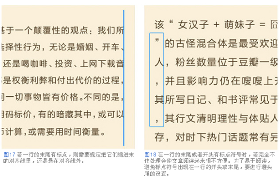 如:中文和英文混排,為使中文和英文和諧自然地結(jié)合,需要把英文的字號(hào)設(shè)定得比中文字號(hào)大一些。還有左右對(duì)齊,必須決定是否把標(biāo)點(diǎn)“懸吊”在對(duì)齊線之內(nèi)。