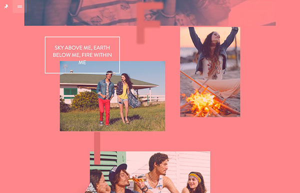 不過,Lois Jeans網(wǎng)頁則采用了另外一種搭配方式,設(shè)計師用不同的色彩來凸顯不同的活動和不同的主題,隨著頁面滾動,背景的顏色隨之變化,和前景滾動變化的圖片相搭配。