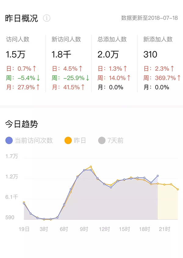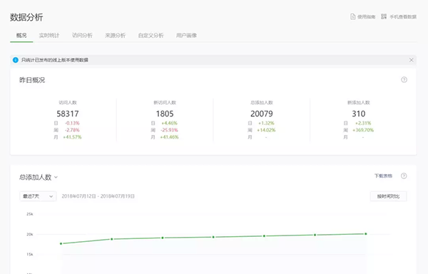 在微信最新版客戶端中,用戶可將使用過的小程序添加為「我的小程序」。已面向開發(fā)者提供「我的小程序」添加數據,小程序開發(fā)者可登錄微信公眾平臺或使用小程序數據助手,查看相關數據詳情: