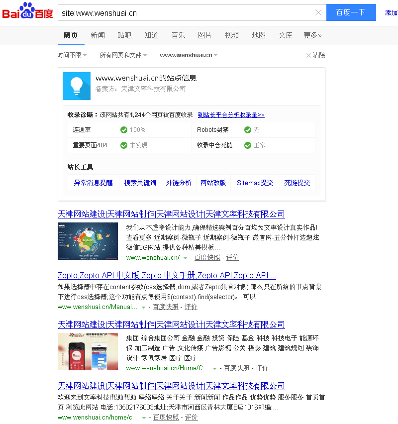 2.百度收錄:在百度里面通過指令site:就可以查詢到。通過收錄,我們可以分析出一系列的問題,如site:zy941.com 見下圖我們可以看到文率科技的首頁在⑴位,如果不在⑴位或者收錄降了很多說明網(wǎng)站被降權(quán)了,這樣我們就可以通過收錄的數(shù)據(jù),對比同等級下的兩個頁面(一個收錄了一個未收錄),找出頁面未收錄的原因,從而改進。
