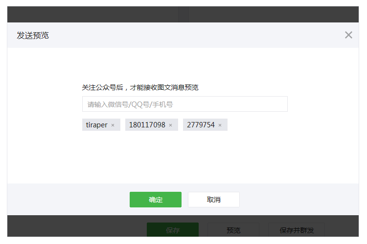 編輯圖文消息時,點擊“預(yù)覽”按鍵,除可輸入微信號發(fā)給需要預(yù)覽的微信用戶外,新增支持已綁定微信號的手機號和QQ號。