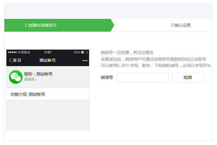 當(dāng)新帳號信息審核通過后,可在“公眾號設(shè)置”進行微信號設(shè)置。運營者可先檢測預(yù)設(shè)的微信號是否可用,若可用再進行下一步操作。此外,設(shè)置微信號時,運營者直接可見微信內(nèi)該公眾帳號的微信號展示效果,提升用戶對微信號的理解。