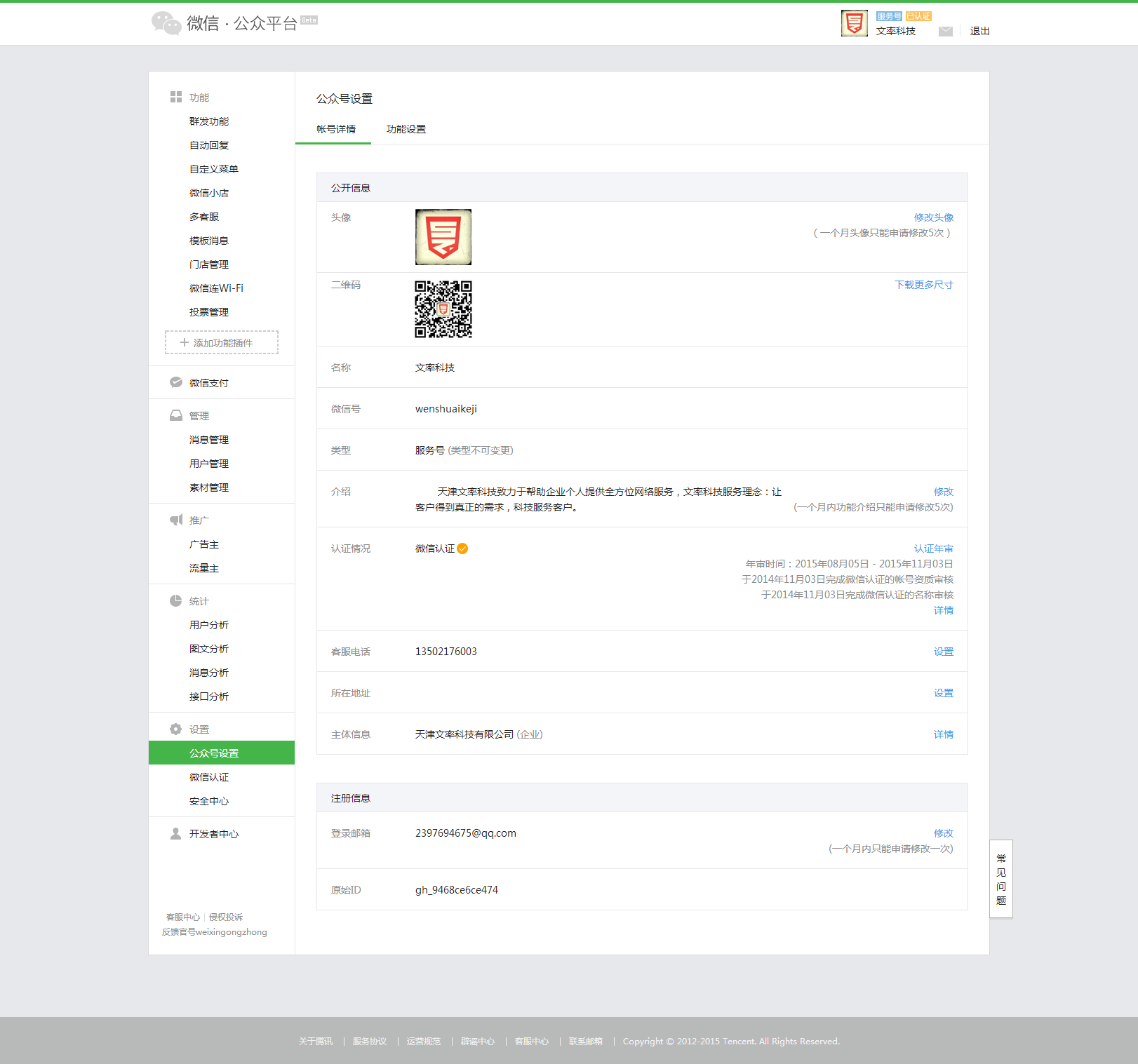 當(dāng)微信公眾號的粉絲達(dá)到一定的數(shù)量后在申請認(rèn)證,這樣更有利于品牌的建設(shè),也方便企業(yè)推送信息和解答消費者的疑問,更重要的是可以借此免費搭建一個推廣平臺,但記得將您公眾帳號的頭像更換為企業(yè)LOGO或者店鋪的招牌,企業(yè)信息和相關(guān)介紹一定要填寫詳細(xì)、仔細(xì)。如:天津網(wǎng)站建設(shè)-文率科技。