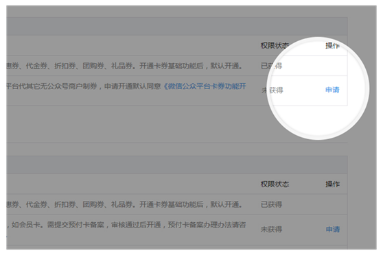 申請路徑:微信公眾平臺-卡券功能-卡券概況-查看資料與權限頁面,申請“開發(fā)者協(xié)助制券“能力,公眾平臺商戶和接口商戶均有入口申請。