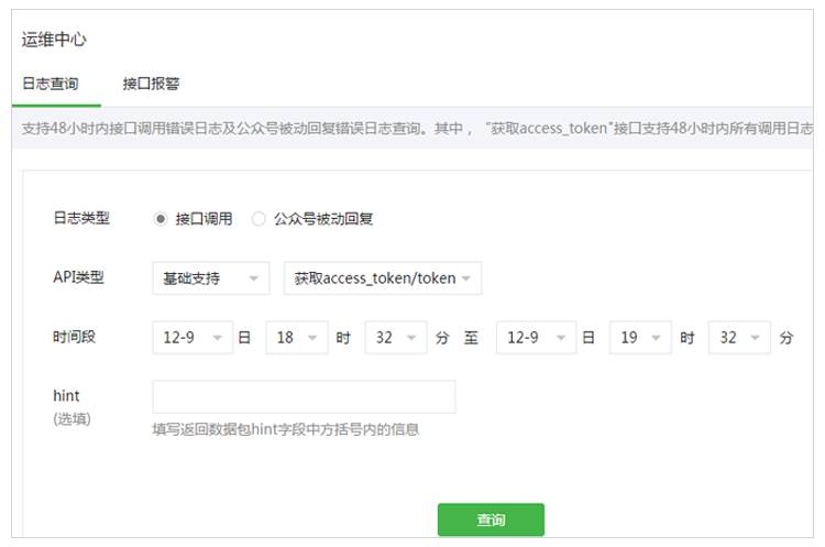 1、新增運(yùn)維中心,提供接口日志查詢功能。當(dāng)公眾號(hào)接口調(diào)用發(fā)生異常時(shí),開發(fā)者可在運(yùn)維中心查看調(diào)用日志,幫助排查問題。