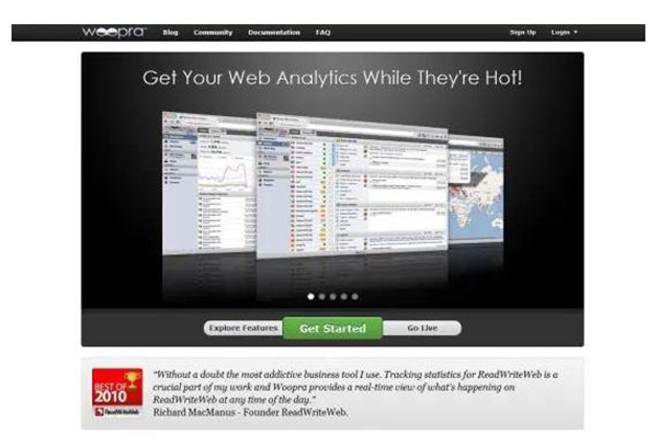 Woopra的出現(xiàn)將實(shí)時(shí)統(tǒng)計(jì)帶到了另一個(gè)層次,它能實(shí)時(shí)直播網(wǎng)站的訪問(wèn)數(shù)據(jù),你甚至可以使用Woopra Chat部件與用戶(hù)聊天。不僅如此,另外,Woopra還擁有先進(jìn)的通知功能,可讓你建立各類(lèi)通知,如:電子郵件、聲音、彈出框等。