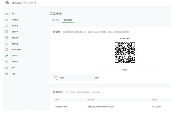 在運維中心,開發(fā)者可掃描二維碼加入小程序報警群。當小程序在運行中出現(xiàn)問題時,系統(tǒng)會推送信息告知報警群內(nèi)的成員。