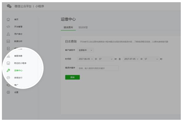 為了幫助開發(fā)者及時發(fā)現(xiàn)小程序運行中出現(xiàn)的問題,公眾平臺新增小程序運維中心。開發(fā)者可以在運維中心查詢小程序最近30天內(nèi)出現(xiàn)的錯誤信息,快速修復問題。