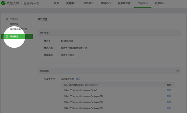 新入口:商戶平臺(tái)>產(chǎn)品中心>開(kāi)發(fā)配置