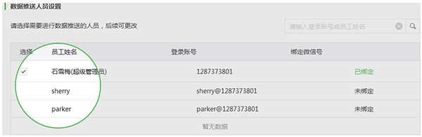 2. 選擇需要接收數(shù)據(jù)推送的操作員(說(shuō)明:接收數(shù)據(jù)推送需要先登記操作員的微信號(hào))