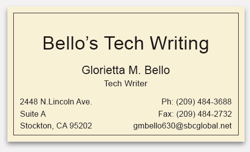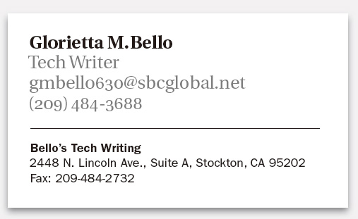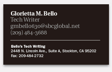 而上圖,同樣的信息,卻是經(jīng)過設(shè)計的。自信的名字及職務(wù)在白色的卡片上左對齊,突出了Glorietta本人,而不是那個了無生氣的企業(yè)名稱,并且該老兄是一名科技作家,有意識的排版突出了“寫作”這一抽象意義。較大的文字自動傳達有效的信息溝通。通過對比(大/小,襯線體,非襯線體)形成有組織、有目的的構(gòu)成,傳達出一種簡樸的風(fēng)格,但并不乏味。如果還想更引人注目,可以象下面一樣更換一下顏色區(qū)域: