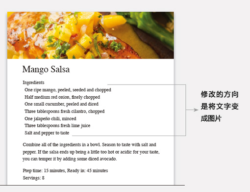 你如何設(shè)計一張與烹飪配方相關(guān)的宣傳卡片?不要將那些用料簡單地用文字列出,顯示它們!這個方式適用于任何指引性的設(shè)計項目。