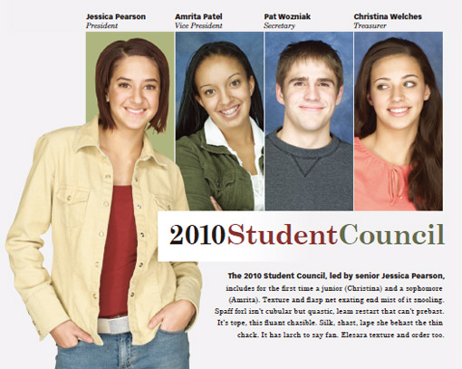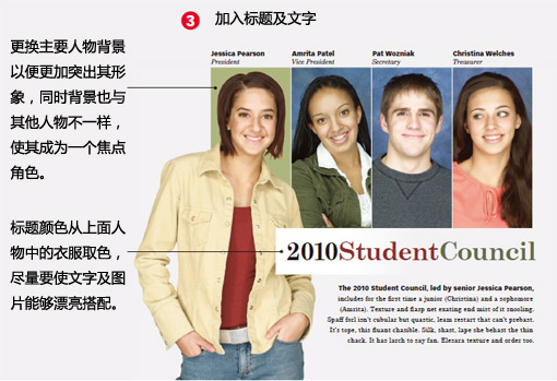 富沖擊力的排版使這張學(xué)生會成員介紹的設(shè)計顯得非常突出,它比普通的那種傻乎乎的團隊照效果更好,因為設(shè)計師可以靈活安排其中每個人的照片,使到整體既具有一種團隊的氛圍,但同時又能顯示出每個人的特性。使這些學(xué)生與觀看的人在情感上距離更近。這樣的排版另外的好處就是能夠讓你在版面空間的安排上更靈活,并且有更多的空間給你的放置標(biāo)題及文字。