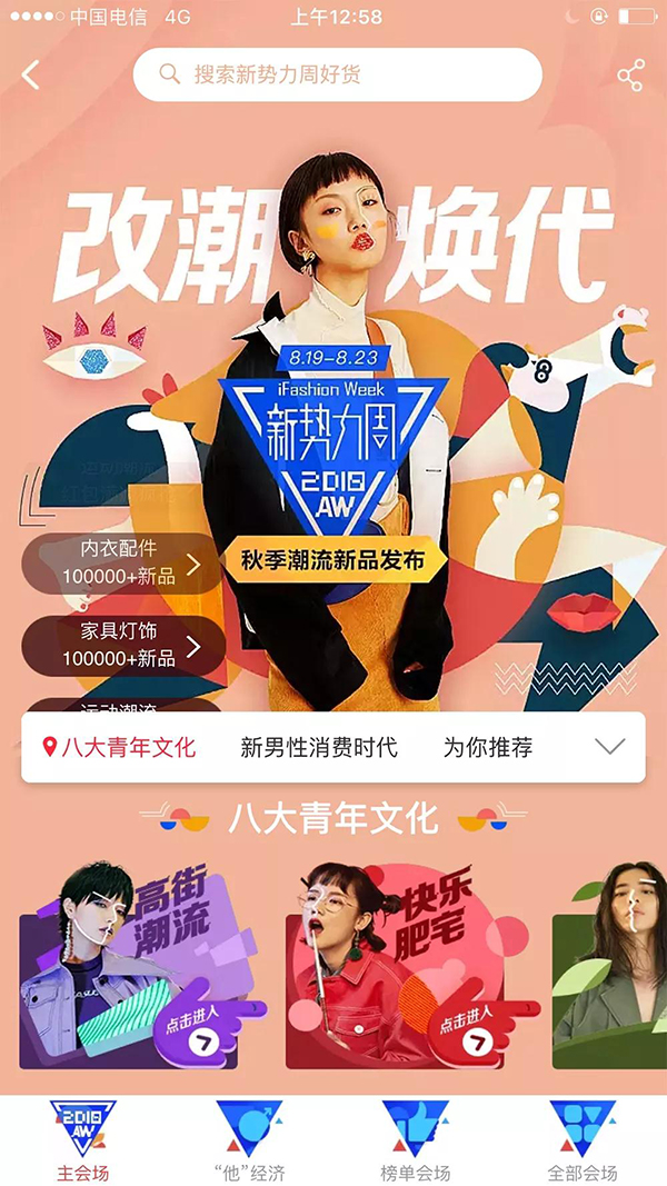 如;當(dāng)前的淘寶西新勢力中有些會(huì)場頁面做的非常的不錯(cuò),視覺風(fēng)格非常的統(tǒng)一,一眼就可以看出來是實(shí)體模特+手繪圖形相結(jié)合的風(fēng)格形式,并且在模特臉部還做了一些圖案輪廓線,然后模特周圍點(diǎn)綴一些手繪圖案做氛圍,有點(diǎn)達(dá)達(dá)主義的趕腳。