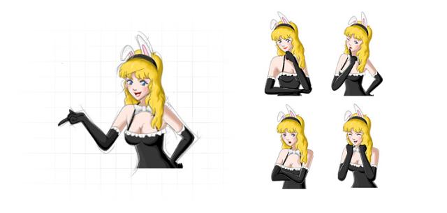 隨后考慮到形象的多場景應用問題,又增加了兔女郎俏皮、興奮、失望等表情動作。并計劃在后期的設計中增加兔女郎的人物個數(shù),塑造3個不同性格不同風格的兔女郎形象來滿足不同用戶的喜好。