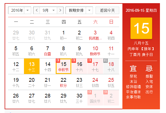 1、放假時間:2016年9月15日至9月17日放假,共3天。9月15日(星期四,農歷中秋節(jié)當日)為國家法定節(jié)假日;9月17日(星期六)公休;9月18日(星期日)公休調至9月16日(星期五);9月18日(星期日)照常上班。
