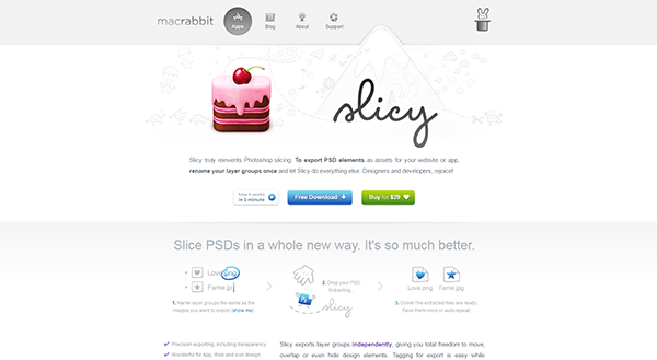 由Macrabblit開發(fā)的一款切圖利器slicy,專門為大家解決在切圖過程中遇到的問題。切圖耗時耗力,有了slicy,可以為你節(jié)省大把的時間,只需要我們在設計psd文件時將需要切圖的圖層命名去設置一下,如:我要切一張背景的話,你只需要命明好名字,retina版設計稿可以直接生成低清的切圖,非常方便。