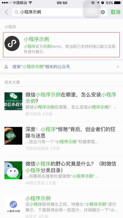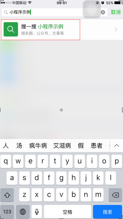 2、在微信的⑴個頁面頂端,有一個搜索條,在搜索條里輸入:小程序示例,然后點擊搜索。