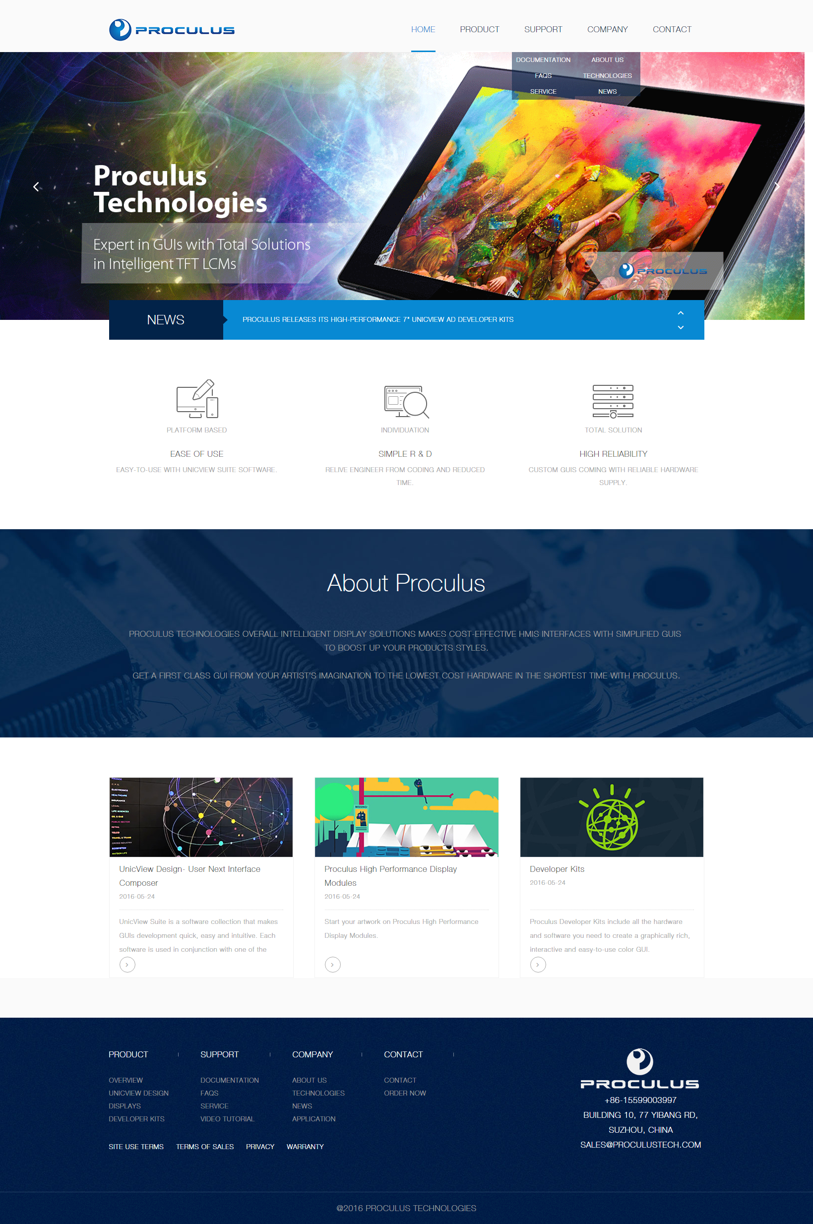 Proculus Technologies intelligent display solution empowers users to easily attain their desired human machine interface (HMI) with minimal time as well as cost effective. Unlike other user interface technologies, the strength that we emphasize is visualization of interface design from low cost software and simplification of programming in project construction as well as easy-to-use in processing. As an overall design-to-display touch screen solution provider, Proculus Technologies saved lots of troubles for users in terms of researching and developing on display part by providing an entire solution including professional software and stable plug-and-play hardware.
