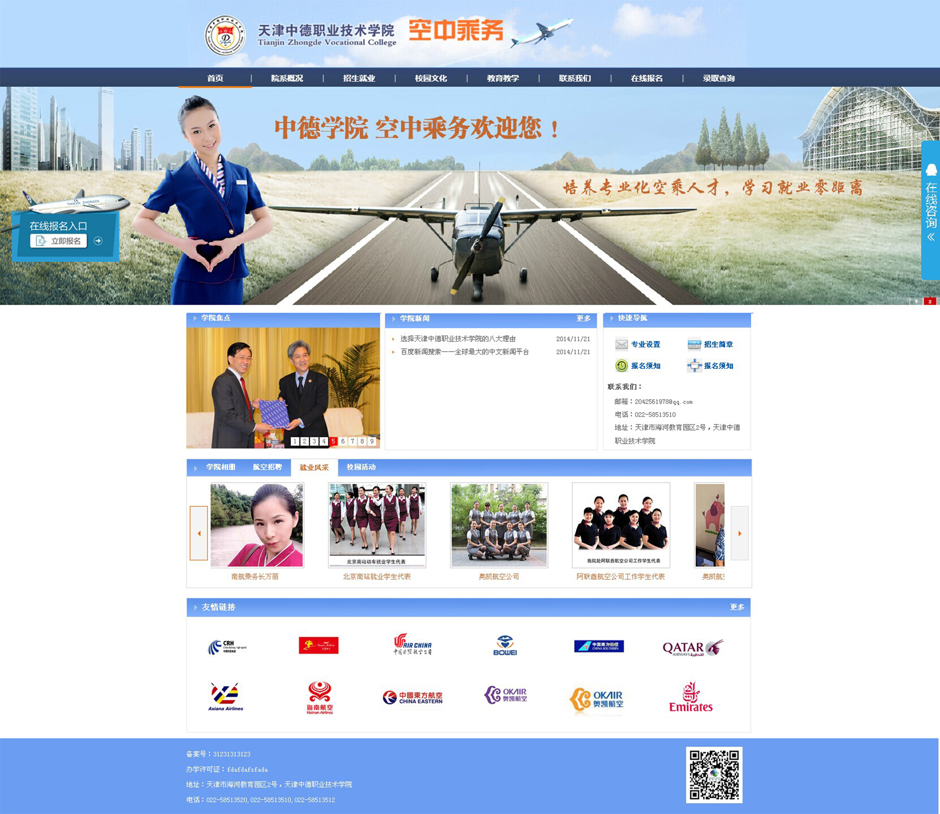 學(xué)院以國際合作為依托,校企合作為支撐,按照企業(yè)提出的人才培養(yǎng)目標(biāo)和知識能力結(jié)構(gòu),校企共同制定人才培養(yǎng)計劃,師資、技術(shù)、辦學(xué)條件合作共享、工學(xué)交替進行,學(xué)生畢業(yè)直接到用人單位就業(yè),企業(yè)避免了人才選擇的盲目性,學(xué)生就業(yè)有了保障,是有利于擴大就業(yè)的高技能人才培養(yǎng)模式。該校特色專注空中乘務(wù)與航空服務(wù)注重理論和實踐相結(jié)合,開展多證教育,擁有高配置的計算機室、語音室、形體訓(xùn)練室、禮儀化妝室、飛機模擬艙等教學(xué)設(shè)施。與此同時,我們通過校企合作,與多家企業(yè)以形成“訂單式”培養(yǎng)的模式。為在校生提供了安全、高薪的民航相關(guān)工作。目前已為國內(nèi)外各大航空公司、機場等輸送畢業(yè)生達8000多名畢業(yè)生,贏得了民航總局及學(xué)生家長的一致認可與好評,被譽為業(yè)內(nèi)奇跡。