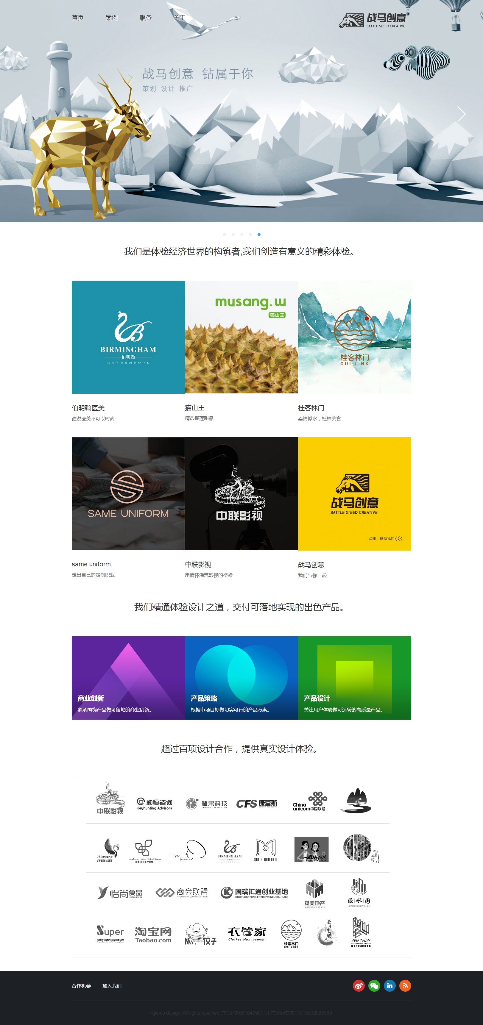 戰(zhàn)馬創(chuàng)意成立于2013年,成立時(shí)間雖短,但三年間我們?yōu)橹袊?guó)各大城市的100余位客戶打造其專屬品牌,有效提升了品牌價(jià)值與市場(chǎng)影響。我們跟隨主流,但絕不盲從跟風(fēng)。把時(shí)下最具代表性的創(chuàng)意設(shè)計(jì)呈現(xiàn)給客戶。我們用設(shè)計(jì)創(chuàng)造創(chuàng)意;用創(chuàng)意推動(dòng)品牌;用品牌影響市場(chǎng)。戰(zhàn)馬創(chuàng)意不斷求新,與客戶攜手發(fā)展。